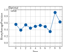 >>> # Example plotting multiple values >>> import torch >>> from torchmetrics.classification import BinaryAveragePrecision >>> metric = BinaryAveragePrecision() >>> values = [ ] >>> for _ in range(10): ... values.append(metric(torch.rand(20,), torch.randint(2, (20,)))) >>> fig_, ax_ = metric.plot(values)