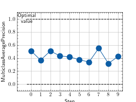 >>> # Example plotting multiple values >>> import torch >>> from torchmetrics.classification import MulticlassAveragePrecision >>> metric = MulticlassAveragePrecision(num_classes=3) >>> values = [ ] >>> for _ in range(10): ... values.append(metric(torch.randn(20, 3), torch.randint(3, (20,)))) >>> fig_, ax_ = metric.plot(values)