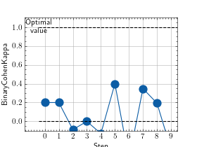 >>> from torch import rand, randint >>> # Example plotting multiple values >>> from torchmetrics.classification import BinaryCohenKappa >>> metric = BinaryCohenKappa() >>> values = [ ] >>> for _ in range(10): ... values.append(metric(rand(10), randint(2,(10,)))) >>> fig_, ax_ = metric.plot(values)