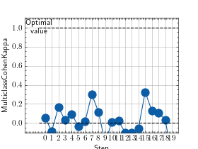 >>> from torch import randn, randint >>> # Example plotting a multiple values >>> from torchmetrics.classification import MulticlassCohenKappa >>> metric = MulticlassCohenKappa(num_classes=3) >>> values = [] >>> for _ in range(20): ... values.append(metric(randn(20,3).softmax(dim=-1), randint(3, (20,)))) >>> fig_, ax_ = metric.plot(values)