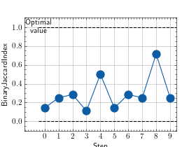 >>> # Example plotting multiple values >>> from torch import rand, randint >>> from torchmetrics.classification import BinaryJaccardIndex >>> metric = BinaryJaccardIndex() >>> values = [ ] >>> for _ in range(10): ... values.append(metric(rand(10), randint(2,(10,)))) >>> fig_, ax_ = metric.plot(values)