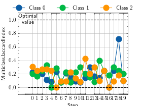 >>> # Example plotting a multiple values per class >>> from torch import randint >>> from torchmetrics.classification import MulticlassJaccardIndex >>> metric = MulticlassJaccardIndex(num_classes=3, average=None) >>> values = [] >>> for _ in range(20): ... values.append(metric(randint(3, (20,)), randint(3, (20,)))) >>> fig_, ax_ = metric.plot(values)