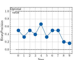 >>> from torch import rand, randint >>> # Example plotting multiple values >>> from torchmetrics.classification import BinaryPrecision >>> metric = BinaryPrecision() >>> values = [ ] >>> for _ in range(10): ... values.append(metric(rand(10), randint(2,(10,)))) >>> fig_, ax_ = metric.plot(values)