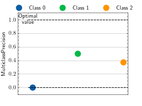 >>> from torch import randint >>> # Example plotting a multiple values per class >>> from torchmetrics.classification import MulticlassPrecision >>> metric = MulticlassPrecision(num_classes=3, average=None) >>> values = [] >>> for _ in range(20): ... values.append(metric(randint(3, (20,)), randint(3, (20,)))) >>> fig_, ax_ = metric.plot(values)