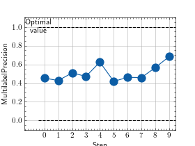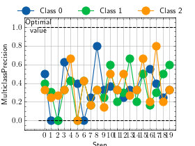 >>> from torch import rand, randint >>> # Example plotting multiple values >>> from torchmetrics.classification import MultilabelPrecision >>> metric = MultilabelPrecision(num_labels=3) >>> values = [ ] >>> for _ in range(10): ... values.append(metric(randint(2, (20, 3)), randint(2, (20, 3)))) >>> fig_, ax_ = metric.plot(values)