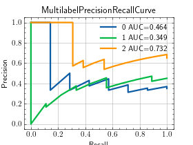 >>> from torch import rand, randint >>> from torchmetrics.classification import MultilabelPrecisionRecallCurve >>> preds = rand(20, 3) >>> target = randint(2, (20,3)) >>> metric = MultilabelPrecisionRecallCurve(num_labels=3) >>> metric.update(preds, target) >>> fig_, ax_ = metric.plot(score=True)