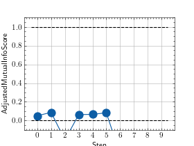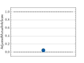 \[AMI(U,V) = \frac{MI(U,V) - E(MI(U,V))}{avg(H(U), H(V)) - E(MI(U,V))}\]Where \(U\) is a tensor of target values, \(V\) is a tensor of predictions, \(M_p(U,V)\) is the generalized mean of order \(p\) of \(U\) and \(V\), and \(MI(U,V)\) is the mutual information score between clusters \(U\) and \(V\). The metric is symmetric, therefore swapping \(U\) and \(V\) yields the same mutual information score.