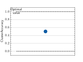 \[\text{Cluster Accuracy} = \max_g \frac{1}{N} \sum_{n=1}^N \mathbb{1}_{g(p_n) = t_n}\]Where \(g\) is a function that maps predicted clusters \(p\) to target clusters \(t\), \(N\) is the number of samples, \(p_n\) is the predicted cluster for sample \(n\), \(t_n\) is the target cluster for sample \(n\), and \(\mathbb{1}\) is the indicator function. The function \(g\) is determined by solving the linear sum assignment problem.