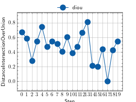 >>> # Example plotting multiple values >>> import torch >>> from torchmetrics.detection import DistanceIntersectionOverUnion >>> preds = [ ... { ... "boxes": torch.tensor([[296.55, 93.96, 314.97, 152.79], [298.55, 98.96, 314.97, 151.79]]), ... "scores": torch.tensor([0.236, 0.56]), ... "labels": torch.tensor([4, 5]), ... } ... ] >>> target = lambda : [ ... { ... "boxes": torch.tensor([[300.00, 100.00, 315.00, 150.00]]) + torch.randint(-10, 10, (1, 4)), ... "labels": torch.tensor([5]), ... } ... ] >>> metric = DistanceIntersectionOverUnion() >>> vals = [] >>> for _ in range(20): ... vals.append(metric(preds, target())) >>> fig_, ax_ = metric.plot(vals)