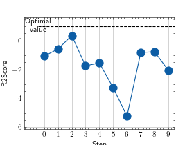 >>> from torch import randn >>> # Example plotting multiple values >>> from torchmetrics.regression import R2Score >>> metric = R2Score() >>> values = [] >>> for _ in range(10): ... values.append(metric(randn(10,), randn(10,))) >>> fig, ax = metric.plot(values)