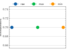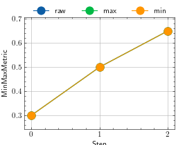 >>> # Example plotting multiple values >>> import torch >>> from torchmetrics.wrappers import MinMaxMetric >>> from torchmetrics.classification import BinaryAccuracy >>> metric = MinMaxMetric(BinaryAccuracy()) >>> values = [ ] >>> for _ in range(3): ... values.append(metric(torch.randint(2, (20,)), torch.randint(2, (20,)))) >>> fig_, ax_ = metric.plot(values)
